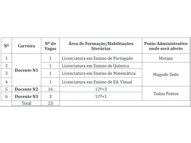 1. Por Despacho de 27 de Fevereiro de 2025, do Excelentíssimo Senhor Administrador do Distrito, torna-se público que está aberto o concurso de ingresso no aparelho do Estado, para o provimento de vinte e três (23) vagas nas carreiras de Docente N1, quatro (4) na carreira de Docente N2, dezasseis (16) e três (3) na carreira de Docente N3, existentes no Serviço Distrital de Educação, Juventude e