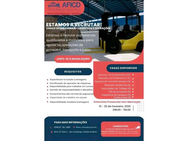 AFICD MOZAMBIQUE está a recrutar profissionais qualificados e motivados para apoiar as operações de armazém, transporte e pátio.