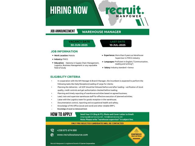 Note: Please write WAREHOUSE MANAGER in subject line.