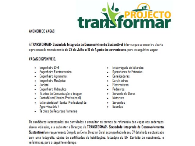 A TRANSFORMAR- Sociedade Integrada de Desenvolvimento Sustentável informa que se encontra aberto o processo de recrutamento de 28 de Julho a 10 de Agosto do corrente ano, para as seguintes vagas: