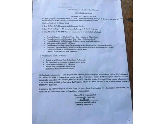 Os Candidatos interessados poderão dirigir as suas cartas de pedido de emprego à Direção do Instituto Técnico Lugenda de Ciências de Saúde Delegação da Matola acompanhadas de fotocópia do Bilhete de Identificação e certificado do curso autenticado, curriculum vitae assinado, fotocópia do NUIT e Certificado Médico de Aptidão Física, a serem submetidos até dia 17 de Abril de 2026 na Secretaria da Delegação sita na Av. 30 de Janeiro, n° 795, Cidade Matola, Contacto 871555900-Secretaria.