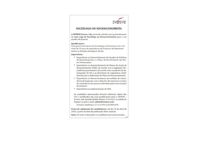 A SWMOZ-Svosve, Lda pretende recrutar um Sociólogo ou Socioeconomista para Maputo, com licenciatura em Sociologia ou Economia e mínimo de 10 anos de experiência em projectos de reassentamento ou estudos de impacto social.