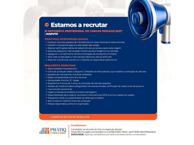 VAGA – MOTORISTA PROFISSIONAL DE CARGAS PESADAS (M/F) |